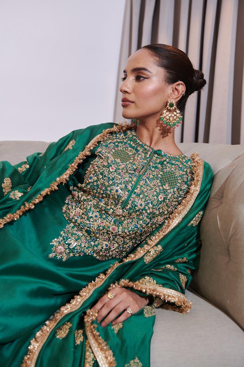 Emerald Green Silk Kurta Set with Zari, Sequins & Cut Dana Hand Embroidery and Heavy Dupatta | Satvik Style