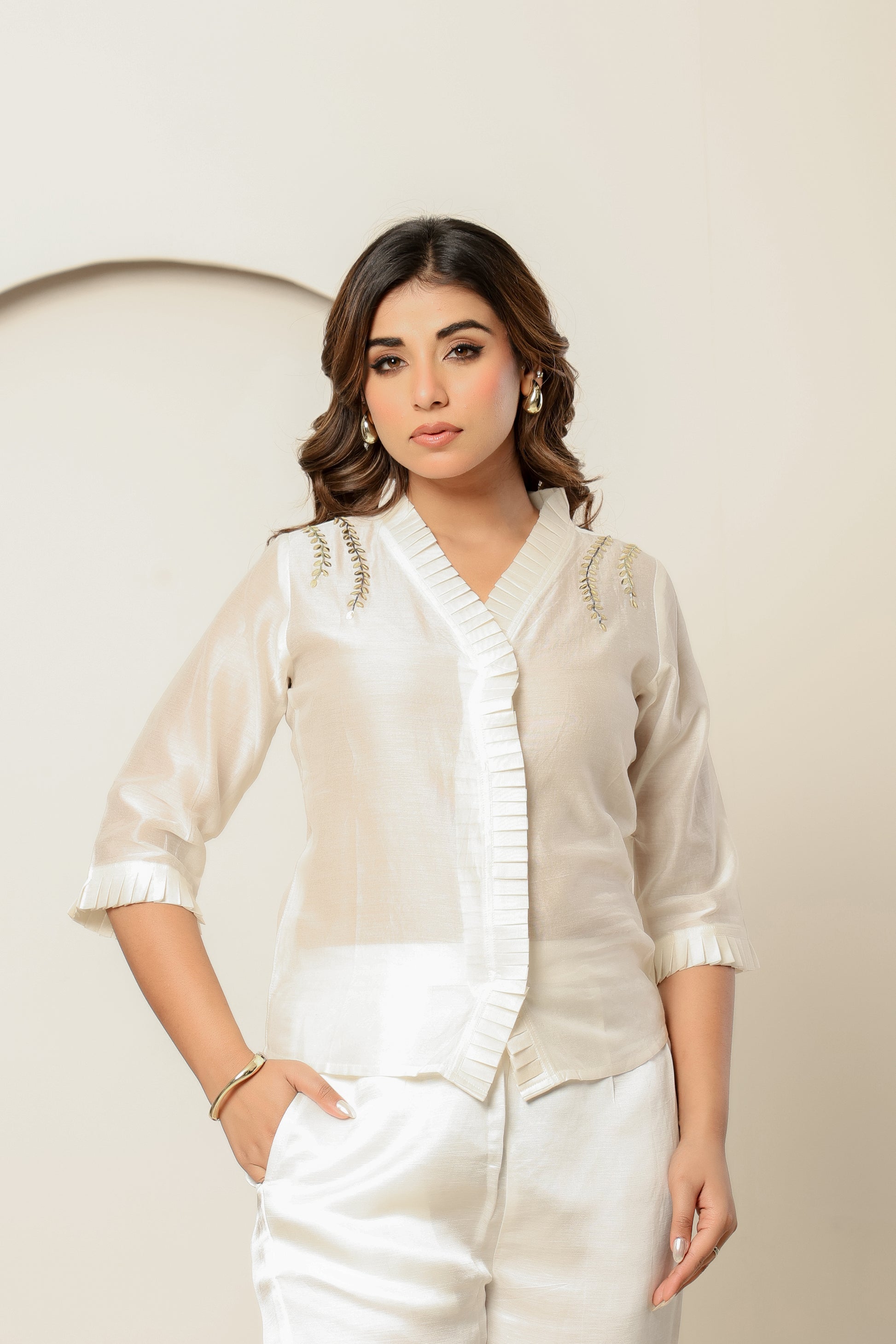 Details: V-neckline with handcrafted pleated ruffles on the placket and cuffs