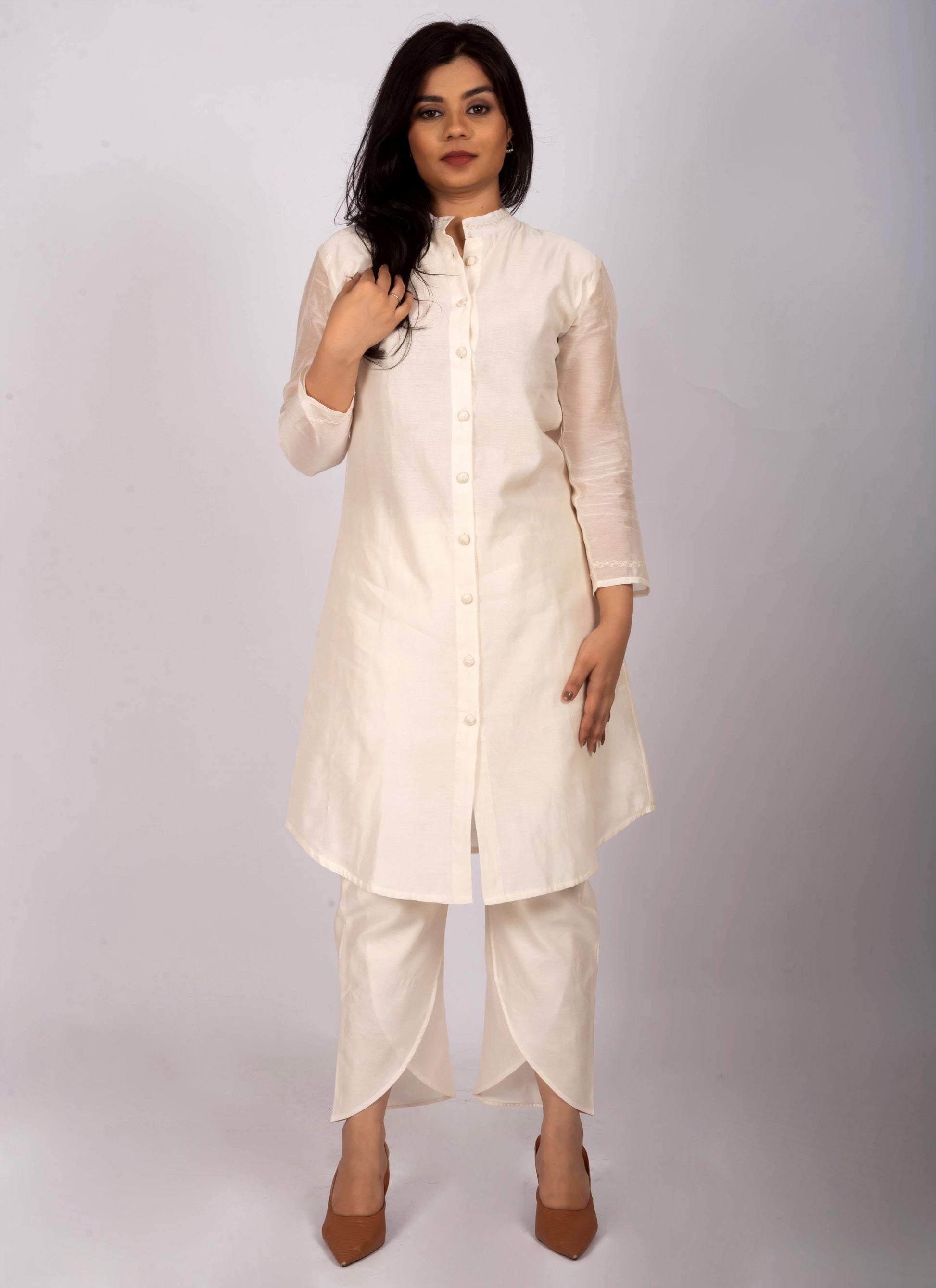 Discover timeless elegance with this ivory Chanderi silk apple cut kurta set for women, designed for festive and special occasions. The kurta features a sophisticated mandarin collar, 3/4th sleeves, and a front button panel adorned with handcrafted embroidered fabric buttons, adding a touch of artisanal detail. Made from premium Chanderi silk, the fabric offers a lightweight, breathable feel with a natural sheen, ensuring all-day comfort and style. Paired with flattering tulip pants, this ethnic wear set blends tradition with contemporary flair. Perfect for festive events, pujas, and elegant daytime outings, this versatile kurta set suits all body types. Style with statement earrings and heels for a refined, graceful look.