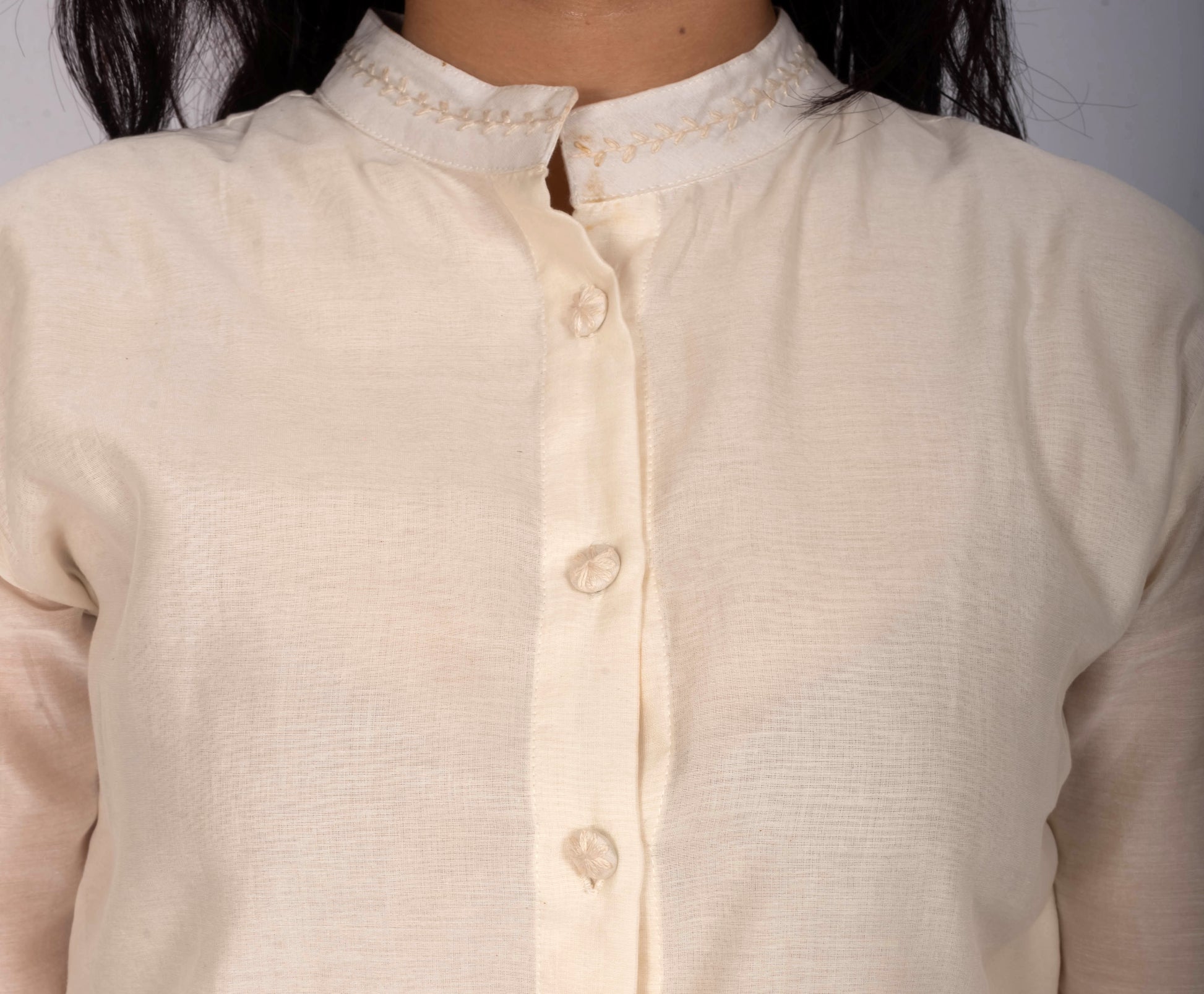 Hand-embroidered fabric buttons for artisanal detail
