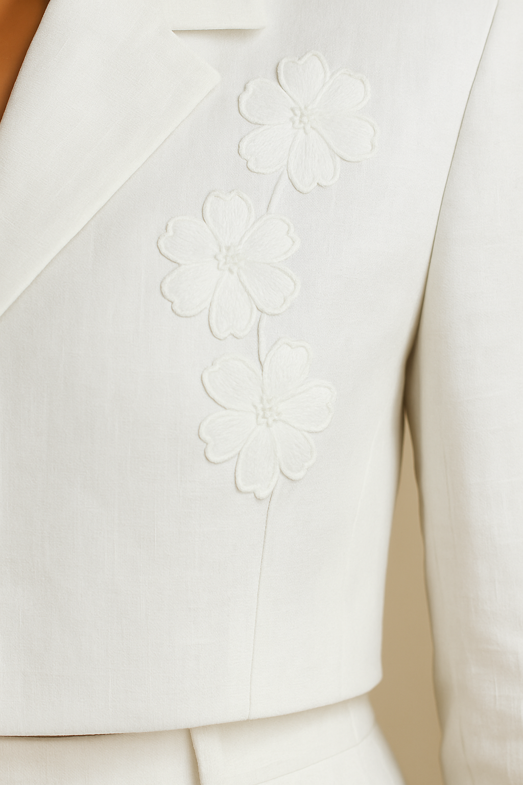 Petal Grace – White Linen Co-ord power suit Set with Tonal Floral Embroidery Cropped Blazer
